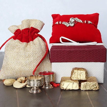 There’s truthfulness in the relationship and that’s one thing that makes it so special for every sister and brother. We have exclusively designed this perfect hamper that will be perfect to show your brother he is the most special person in your life. Hurry to grab this bunch of love for your brother!! It contains: • 100gm of Cashew (Kaju) in Potli • 1 Stone Studded Silver & Red stone rakhi • 100gm of Assorted Chocolates with a beautiful Box • Roli & chawal with attractive container